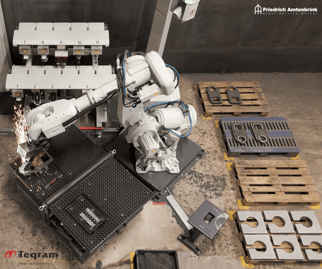 Teqram entwickelt und liefert völlig autonome Robotersysteme zum Be- und Entladen von Entgratungs-, Richt- und Strahlanlagen sowie zum Entschlacken, Schleifen und Entgraten von Blechteilen. Mit dem fortschrittlichen 3D-Vision-System EasyEye und der KI-basierten Steuerung arbeiten die Roboter von Teqram völlig autonom. Sie erkennen automatisch Paletten, Stapel und Produktgeometrien, so dass keine manuelle Programmierung erforderlich ist