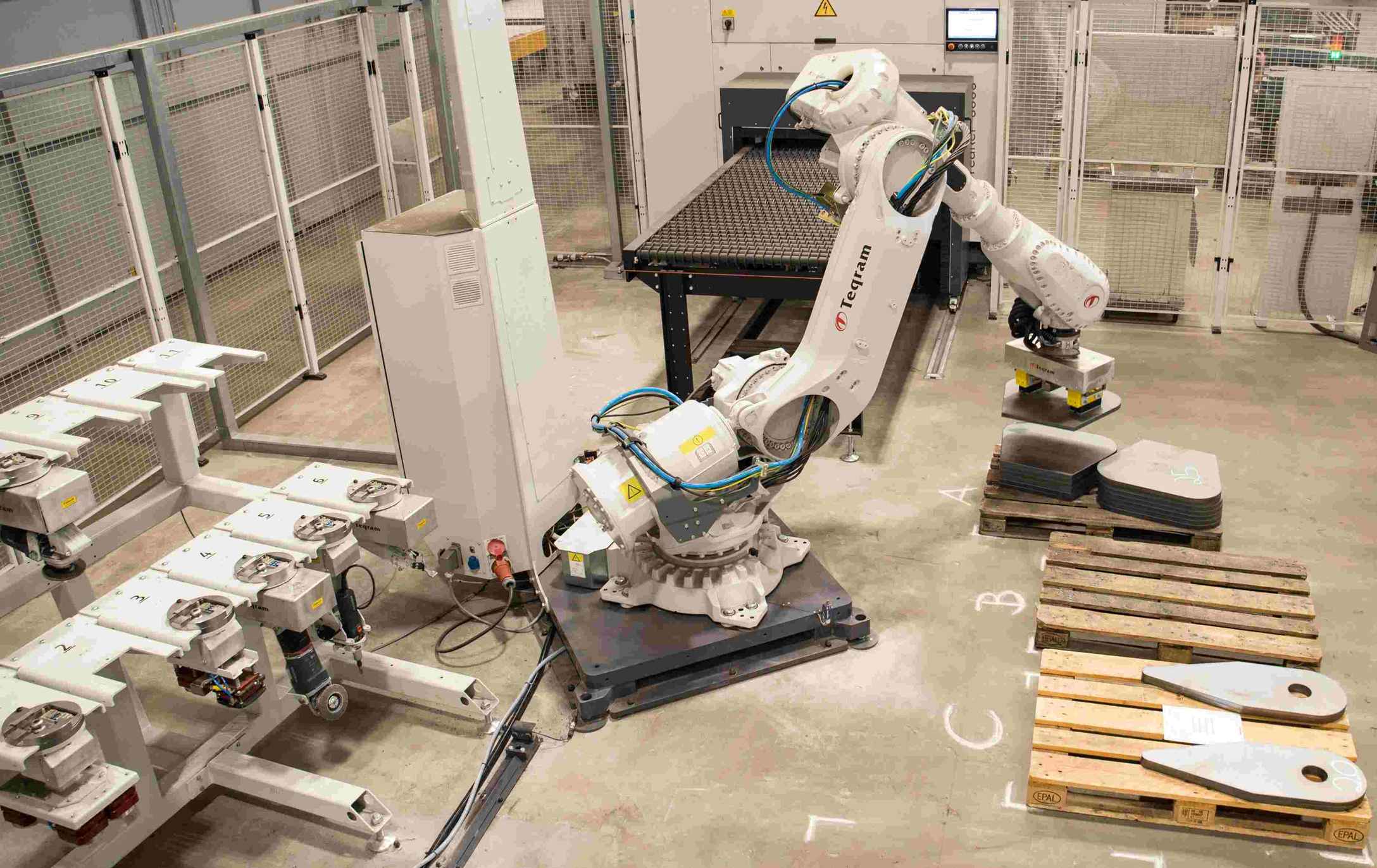 Teqram entwickelt und liefert autonome Robotersysteme zum Be- und Entladen von Entgrat-, Richt- und Strahlmaschinen sowie zum Entschlacken, Schleifen, Entgraten und Verrunden von Blechteilen. Die Robotersysteme von Teqram arbeiten dank des EasyEye 3D-Vision-Systems in Kombination mit der KI-basierten Steuerung völlig autonom. Paletten, Stapel und die Produktgeometrie werden automatisch erkannt, ohne Programmierung und Teachen.