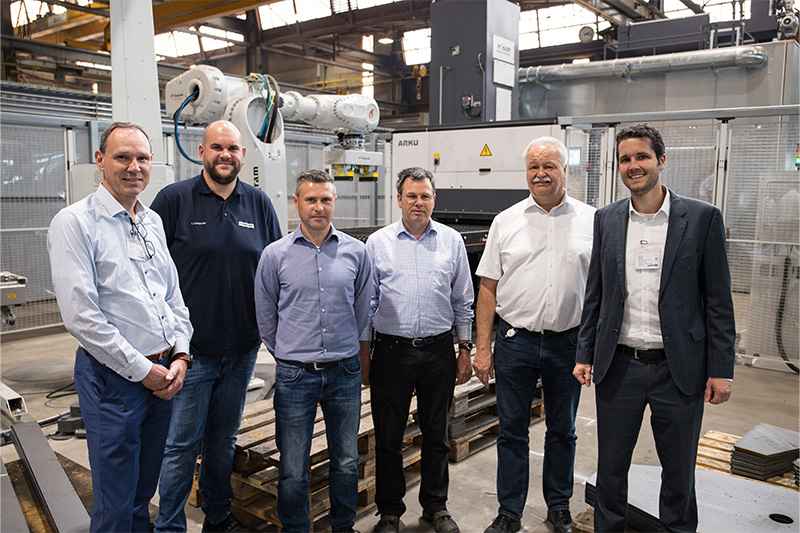 Die Maschine wird offiziell an Liebherr übergeben (von links nach rechts): Markus Lindörfer (Teqram BV), Lorenz Lamparter (Liebherr-Werk Biberach GmbH), Vasili Schaermann (Rösler Oberflächlentechnik GmbH), Andreas Brauner (Liebherr-Werk Biberach GmbH), Robert Piesche (Liebherr-Werk Biberach GmbH) und Stefan Sauter (ARKU Maschinenbau GmbH).