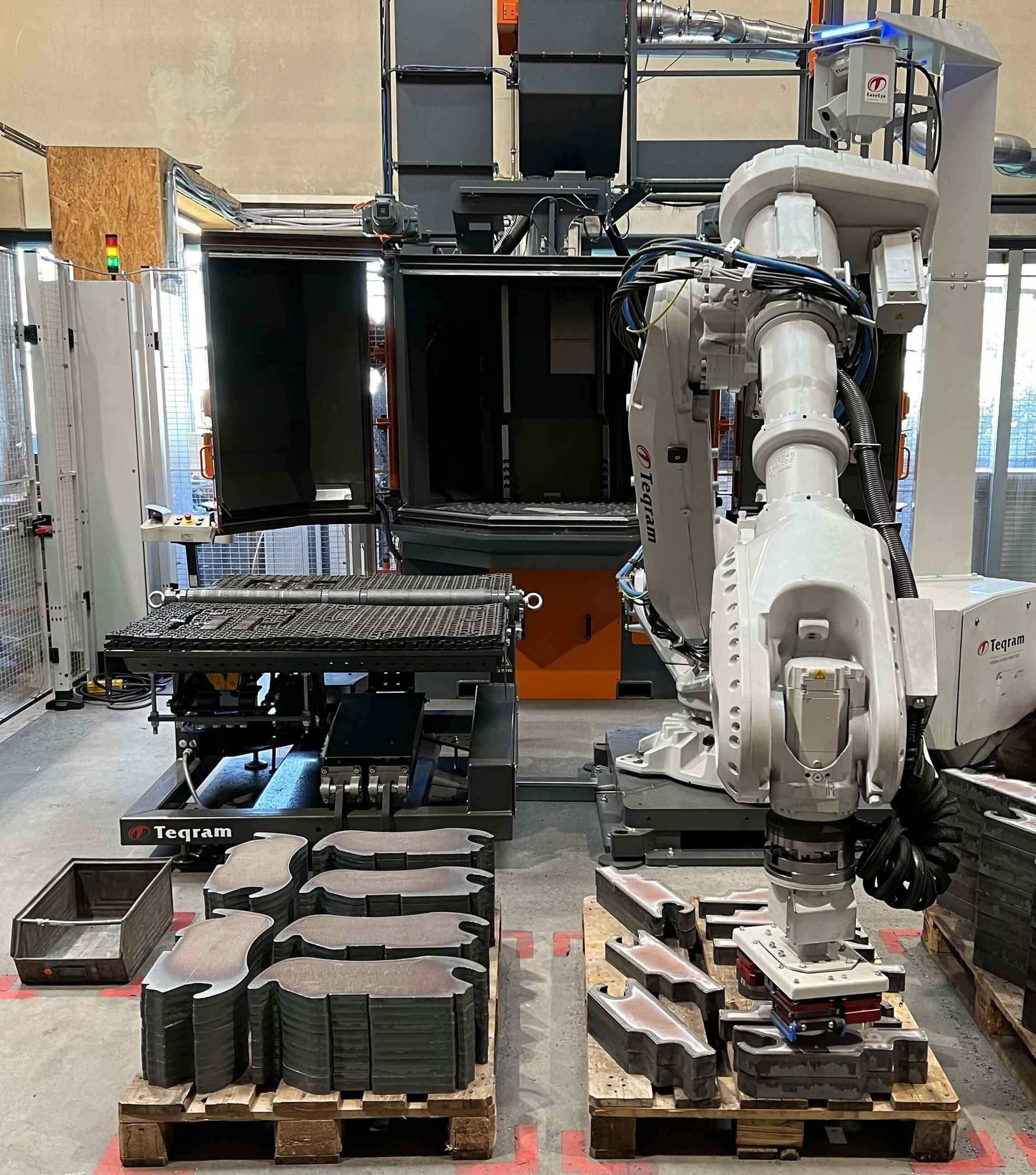 Was Teqram besonders auszeichnet, ist die Vision-Technologie. Über das EasyEye-System und 3D-Vision-Sensoren erkennt der Roboter die Konturen der Werkstücke ohne aufwändiges einlesen von Zeichnungen. Auf Basis der ermittelten Geometrie und Materialstärke wird das Gewicht berechnet und der passende Greifer ausgewählt. Das Werkstück wird dann automatisch auf dem EasyFlipper positioniert. Der EasyFlipper wendet das Bauteil, sodass die beidseitige Bearbeitung optimal erfolgen kann.