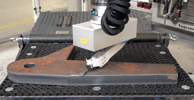 Das innovative System von Teqram bietet maximale Flexibilität. Die Brennzuschnitte werden auf Europaletten in die Roboterzelle gestellt, wo der Bediener lediglich die gewünschte Bearbeitungsqualität auswählt. Von der einfachen Schlackenentfernung bis hin zum Schleifen von Schmalseiten oder dem Erstellen eines 2-mm-Radius an allen Ecken – der Teqram EasyGrinder meistert jede Anforderung mit verschiedenen, automatisch wechselnden Werkzeugen. Auch das Wenden und Greifen der Teile erfolgt vollautomatisch.
