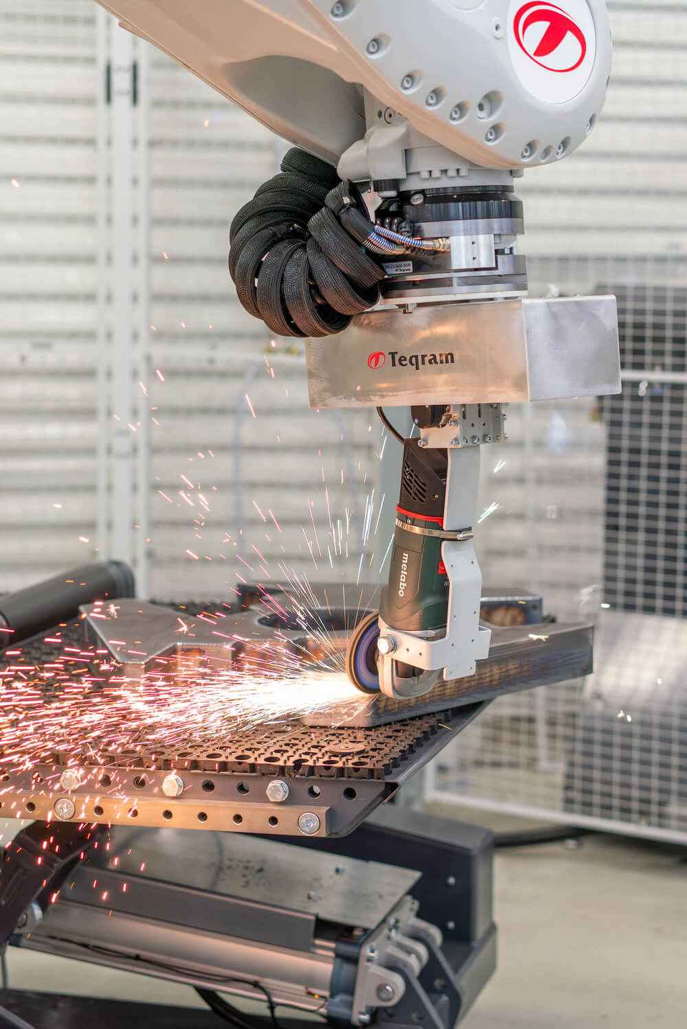 Teqram entwickelt und liefert Handhabungssysteme und völlig autonome Robotersysteme zum Be- und Entladen von Entgratungs-, Richt- und Strahlanlagen sowie zum Entschlacken, Schleifen und Entgraten von Blechteilen. Mit dem fortschrittlichen 3D-Vision-System EasyEye und der KI-basierten Steuerung arbeiten die Roboter von Teqram völlig autonom. Sie erkennen automatisch Paletten, Stapel und Produktgeometrien, so dass keine manuelle Programmierung erforderlich ist.