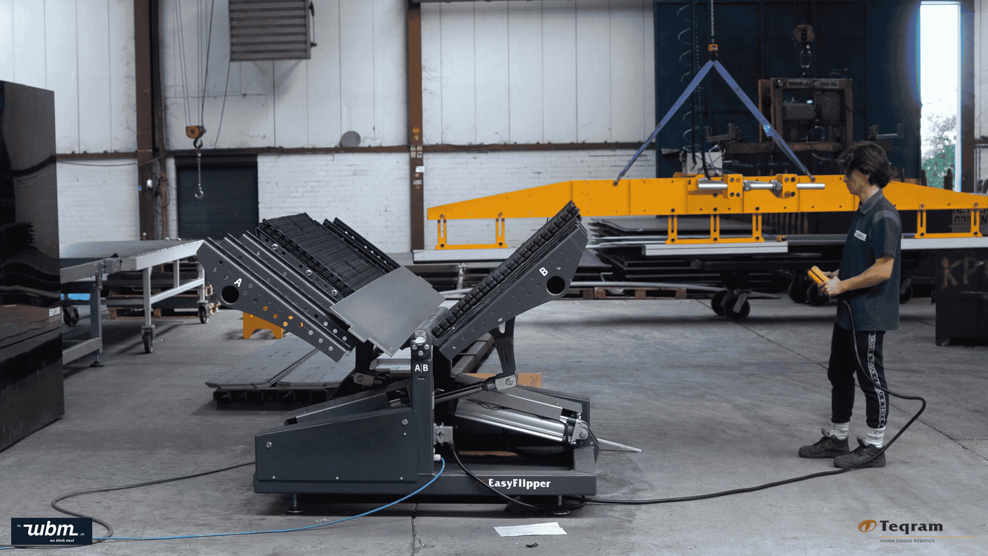 Die WBM B.V. aus Stramproy (NL) ist spezialisiert auf komplexe Blechprodukte aus hoch- und verschleißfestem Stahl. Mit dem EasyFlipper von Teqram wendet WBM schwere und lange Blechteile heute schnell, sicher und ergonomisch – direkt im Produktionsprozess.